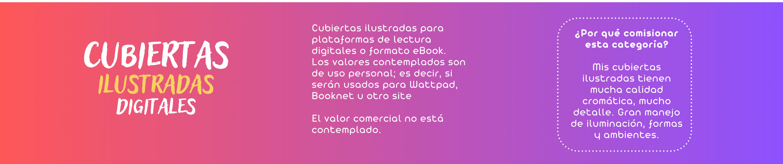 Acerca de cubiertasTodo tipo de género de libro; tales como: romántica adulta, juvenil, ciencia ficción, fantasía, paranormal, terror, etc. Trabajo cubiertas para libros young adult y con temática adulta. Trabajo contenido erótico más no sexual explícito solo en escenas ilustradas o guardas pero no en cubiertas. Trabajo contenido de todo tipo de parejas tanto heterosexuales como LGBTQ+.