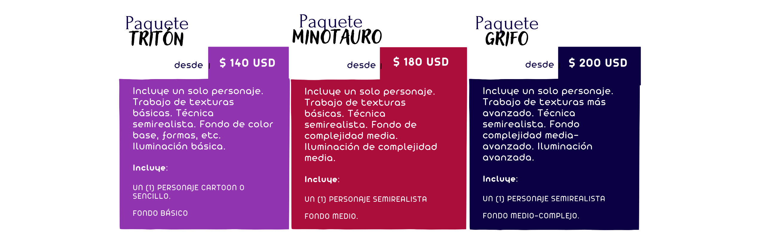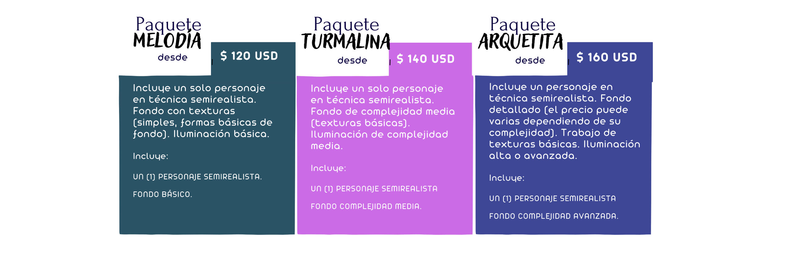 c) Si desea alguno de estos paquetes en un color más básico o boceto a color, se le restará un 20% al valor total. Tenga en cuento que esto afectará la iluminación por lo tanto será básica.