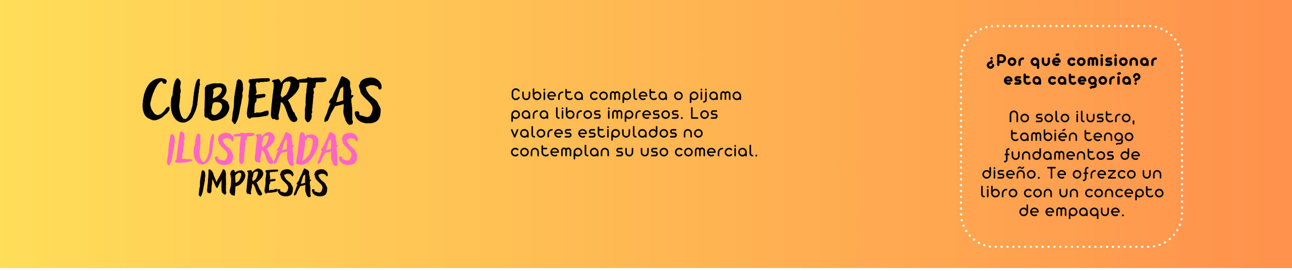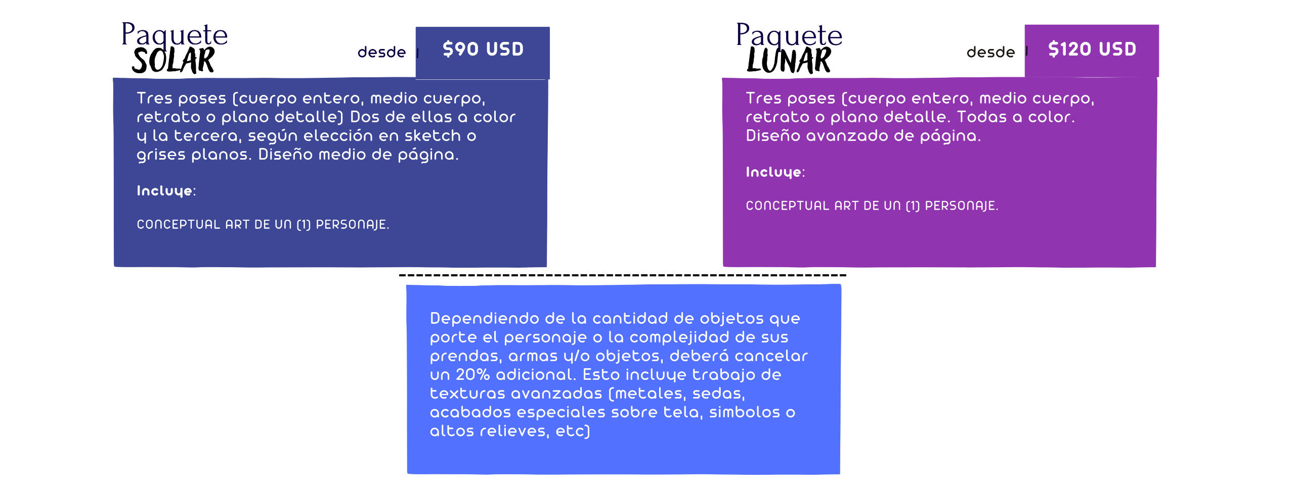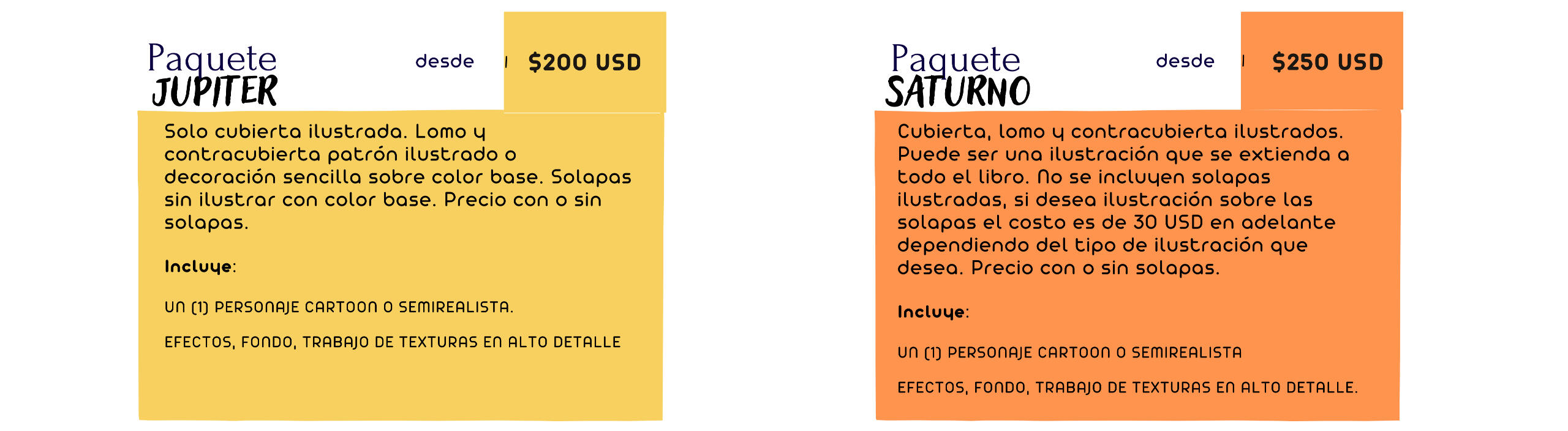 e) El fondo y la interacción de los personajes con este están incluidos según las propuestas que le entrege, siguiendo siempre las especificaciones de cada paquete.ConsideracionesTodos los paquetes cuentan con alto nivel de composición, tipográfica y de detalle. Te ofrezco una edición cuidada, con gran valor cromático y fundamentos de ilustración y diseño.Otros valoresGuardas: $40 USD en adelante, dependiendo de la complejidad del diseño o patrón. Este valor se puede mezclar con los otros paquetes que manejo para escenas ilustradas (ver más abajo), así las guardas pueden ser escenas ilustradas.Separadores: 30 USD en adelante, dependiendo de la complejidad. Pero este precio incluye todo lo básico (objetos ilustrados para marcadores, diseño de texto para citas y añadir la información de contacto o redes sociales). Ilustro marcapáginas que pueden contener personajes ilustrados, los valores se sumarían al inicial: (80 USD medio cuerpo, 40 USD rostro) si el personaje portará un arma o artículo especial, se suman los porcentajes especificados más arriba.Bordes del libro: 20 USD o más, dependiendo de la complejidad. Objetos ilustrados, efectos o patrones de color, etc.Solapas: 30 USD o más, dependiendo de la complejidad. La ilustración se puede extender a toda la portada si eliges el Paquete Saturno, por ejemplo.