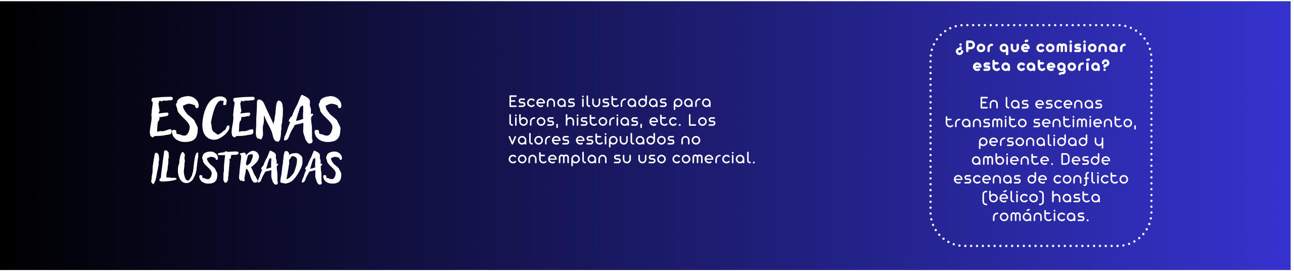 Acerca de escenas ilustradasTrabajo escenas ilustradas de todo tipo, cargadas de mucha emoción, de muerte, batalla, etc. No hay ninguna temática que en particular no trabaje, salvo escenas ilustradas de contenido explicito sexual o violento.