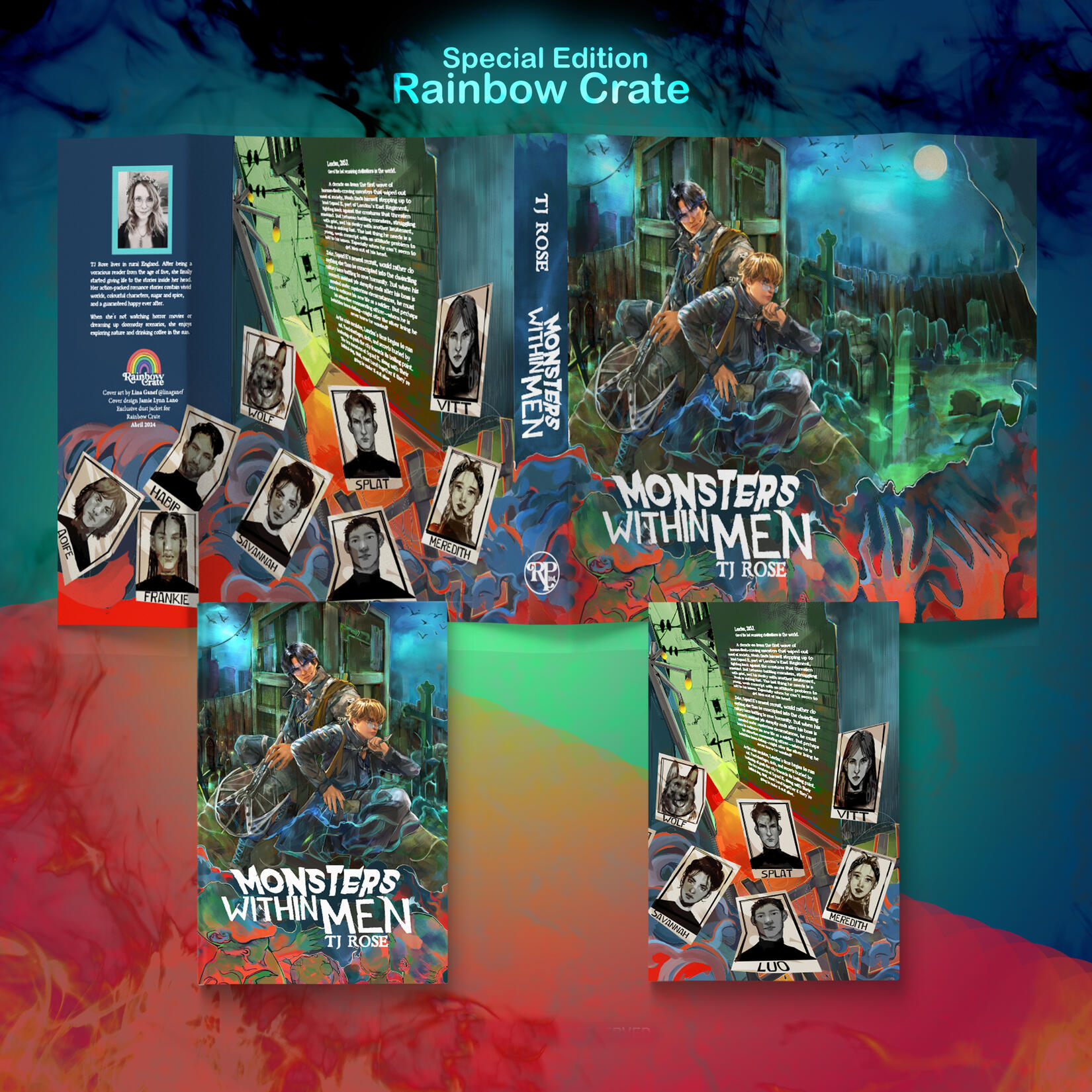 Dust jacket illustrated for the special edition of the book Monsters Within Men by TJ Rose, published by Rainbow Crate. The book was part of the April 2024 themed box. Adult post-apocalyptic romance.