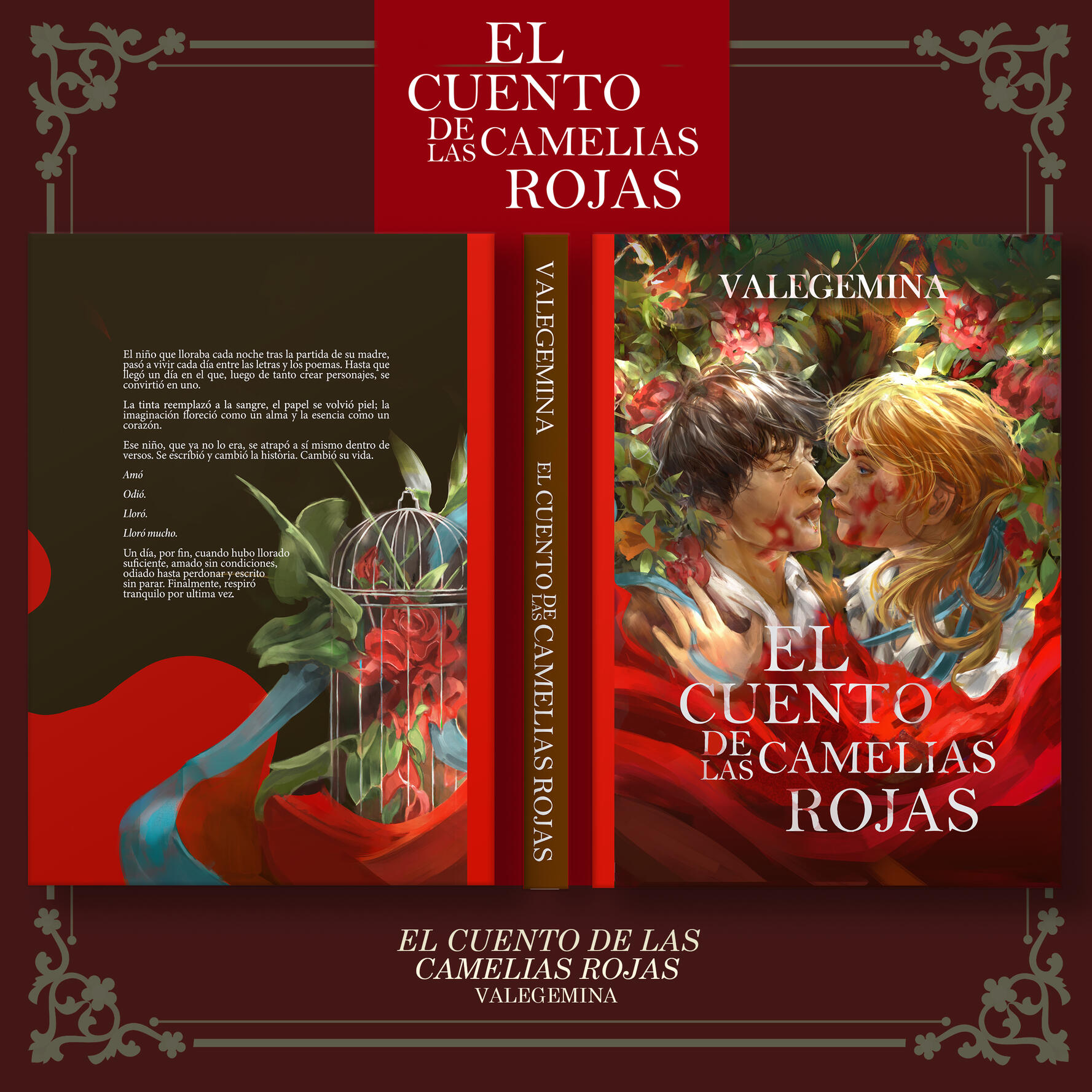 Cubierta ilustrada para la novela El Cuento de las Camelias Rojas de la autora ValeGemina. Un romance de época. Dos hombres heridos buscando amarse.