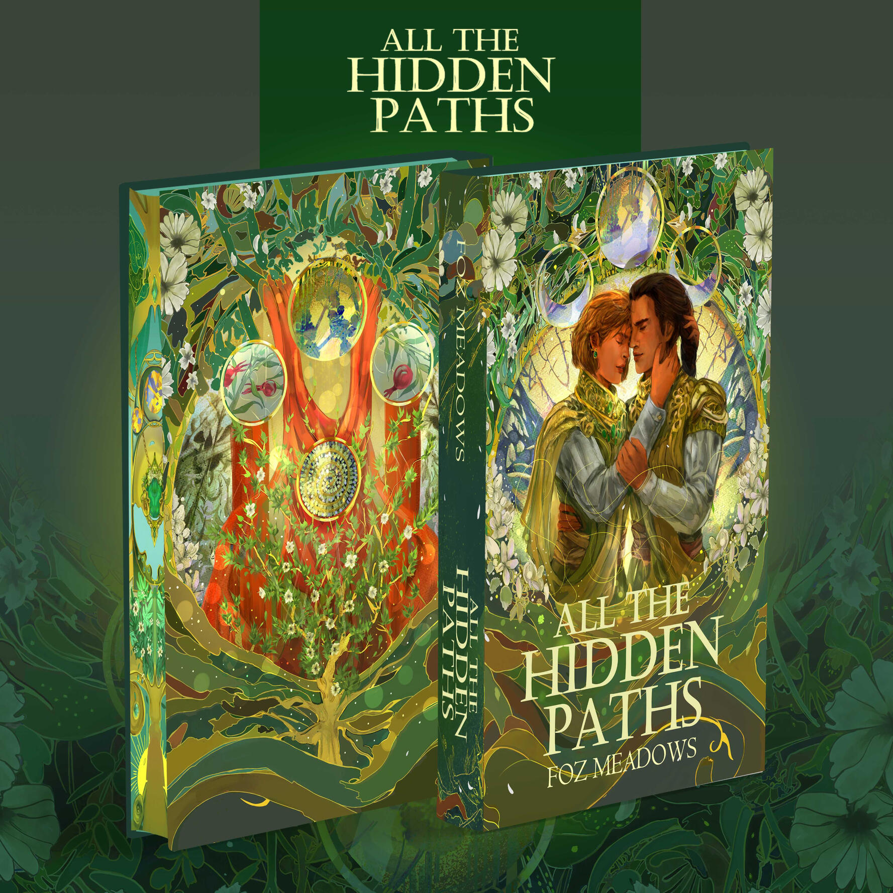 Sobrecubierta completamente ilustrada y bordes de página para una edición especial de The Tithenai Chronicles Strange and Stubborn Endurance, All The Hidden Paths) de Foz Meadows. Esta edición especial es exclusiva de Dazzling Bookish Shop.